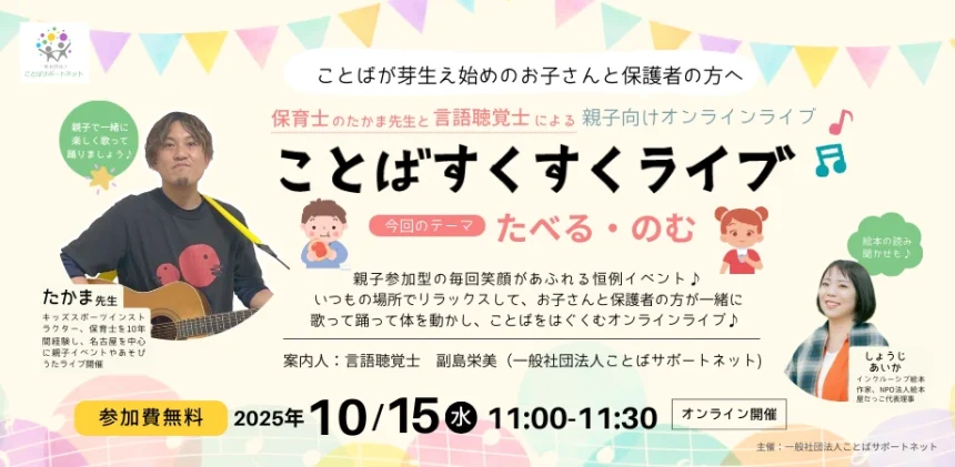 ことばの育ちに心配事がある方や、ことばの発達がゆっくりなお子さん、海外にお住まいの方も、安心してご参加いただければと思います。