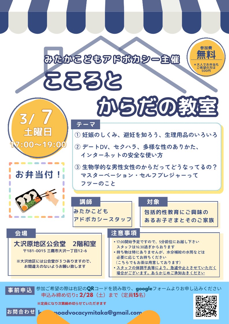 今回の「こころとからだの教室」は「妊娠の仕組み、避妊を知ろう、生理用品のいろいろ」「デートDV、セクハラ、多様な性のあり方、インターネットの安全な使い方」「生物学的な男性女性のからだってづなってるの?マスターベーション、セルフプレジャーってフツーのこと」がテーマになります。